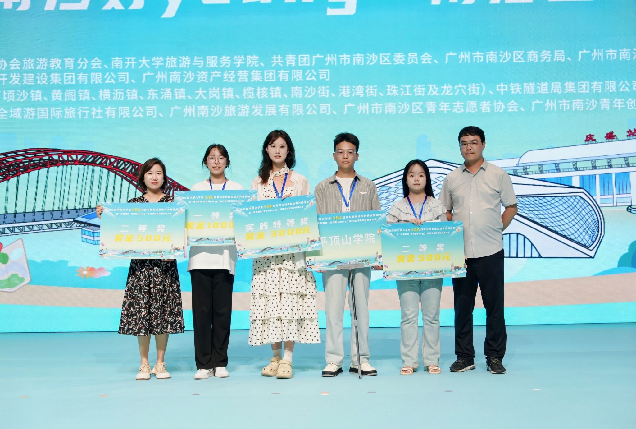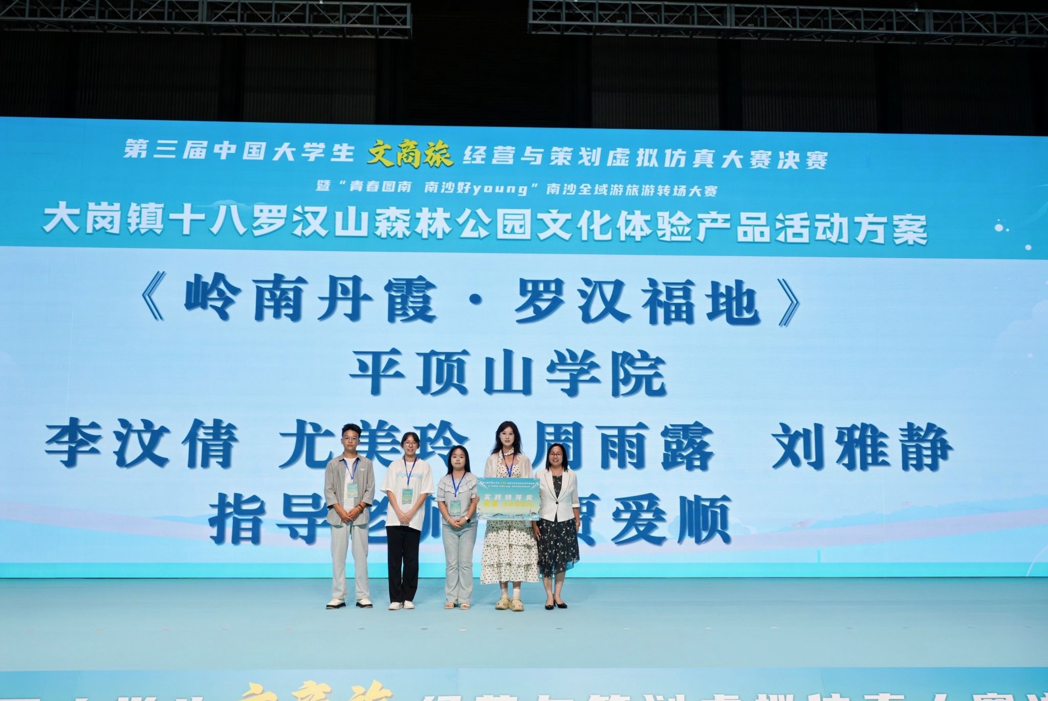 本次大赛由中国旅游协会旅游教育分会、南开大学旅游与服务学院联合广州市南沙区多家单位及企业共同主办。自今年1月正式启动以来,大赛共吸引了来自全国(包含港澳台地区)以及海外173所高校的617支队伍、3085名学生踊跃参与。初赛采用旅游管理虚拟仿真实验教学系统线上竞技的形式,共有309支队伍成功晋级决赛。决赛包含宏观经济模拟实验和实践项目策划方案两个环节,旨在综合考察学生的数字化运营管理能力、策划能力以及将理论知识与实际情况相结合的能力。本次大赛特别设置了文商旅实践策划可选项目,要求参赛队伍围绕广州市南沙区10个街镇的文旅项目开展调研实践,并完成相应的项目策划方案。项目提供单位将对每个项目进行评审,最优秀的方案将获得实践特等奖,奖金为3000元。李汶倩队的《岭南丹霞·罗汉福地》策划方案经过反复打磨,深入挖掘项目的核心价值与特色,最终凭借方案的扎实性与创新性,荣获实践特等奖。