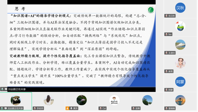 2025年10月9日晚19:30,化学与环境工程学院李艳岭、刘会鹏老师应邀为旅游与规划学院教师开展“人工智能校级教学改革研究与实践专项项目”成果推广的线上宣讲。