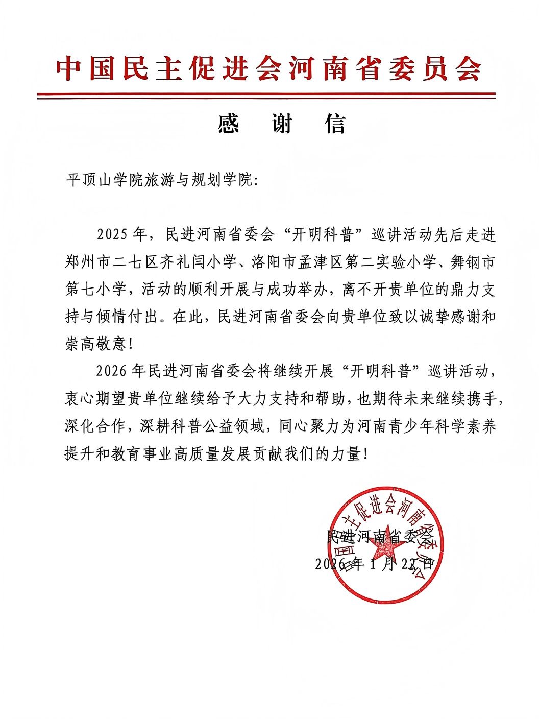 近日,地理与环境工程学院收到中国民主促进会河南省委员会发来的感谢信,信中对我院教师积极参与科普巡讲活动的专业表现给予高度肯定,同时对我院大力支持科普公益事业、践行高校社会服务使命的行动表示感谢。